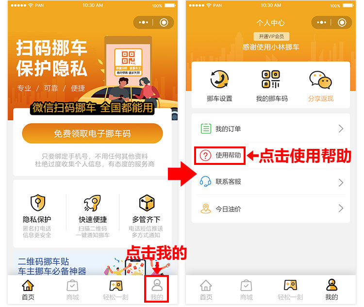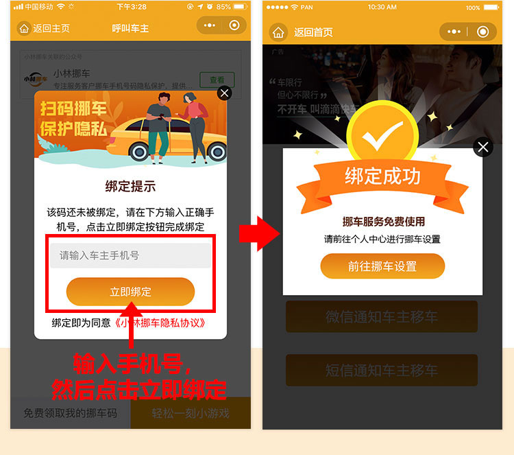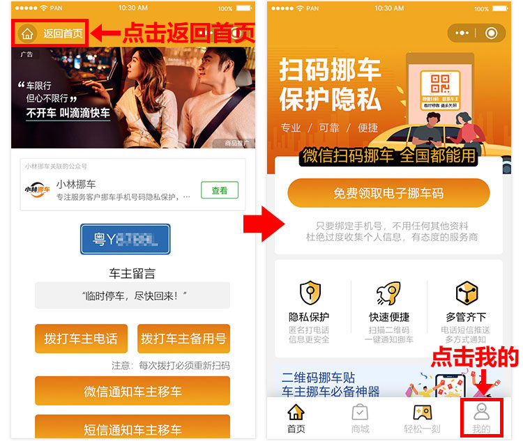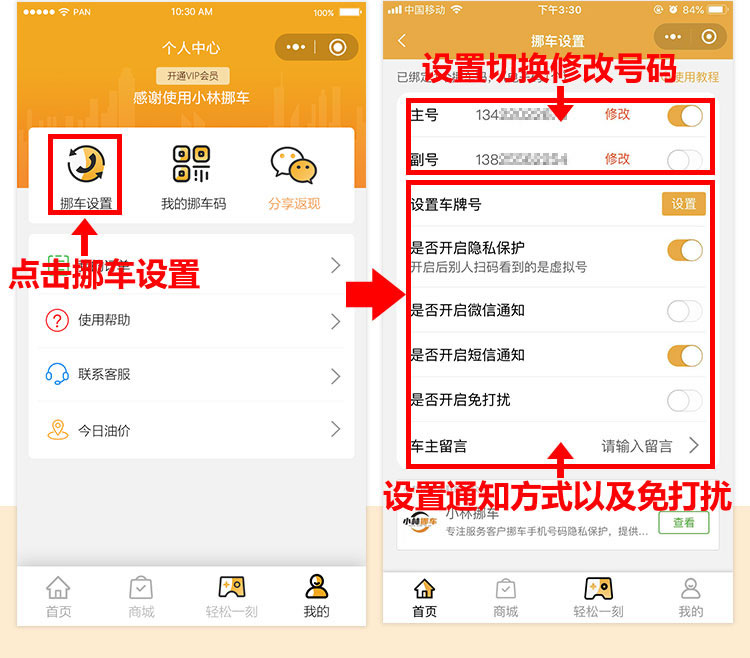 在“我的”界面点击“挪车设置”可以设置切换修改号码、通知方式以及免打扰