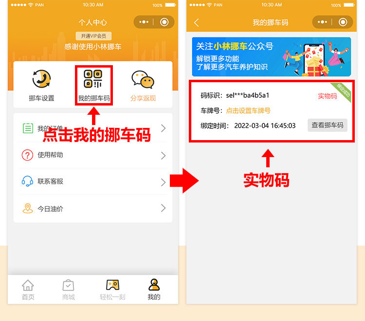 2.然后在“我的”界面点击“我的挪车码”看到有“实物码”就是绑定成功